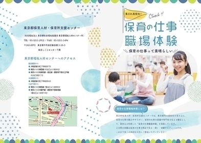東京都内の高校生に対し、保育の仕事の意義や専門性、魅力ややりがいを伝える機会として、保育現場での職場体験事業を実施します。保育の仕事に対する理解を深め、将来の進路選択の際の参考にしてもらうことを目的としています。